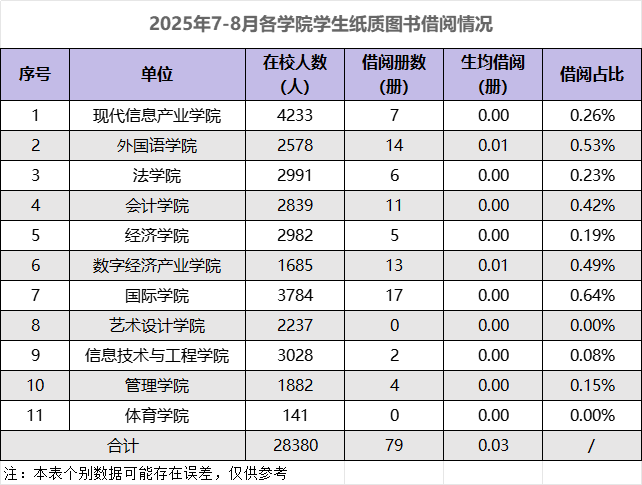 现将学校7-8月各学院学生读者纸质图书借阅情况公布如下: 图书馆 9月3日