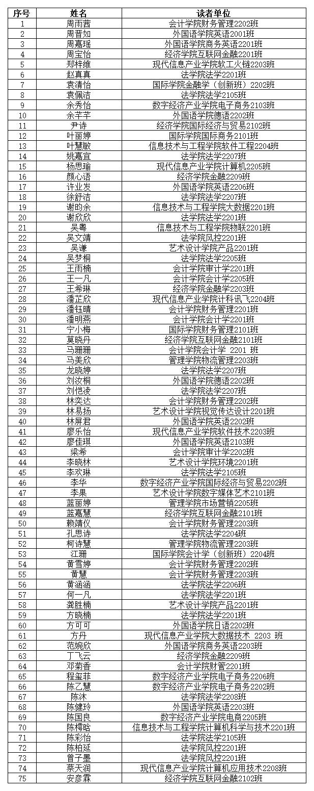 为发挥热爱读书师生的榜样示范作用,引领读者“爱读书、读好书、善读书”,克服读书的盲目性和随意性,图书馆开展了第三期“好书推荐”活动。在本次活动中共征集到104位同学的好书推荐来稿,经专业评定,共计75位同学推荐的185本书籍入选“第三期好书推荐书单”,具体名单如下。