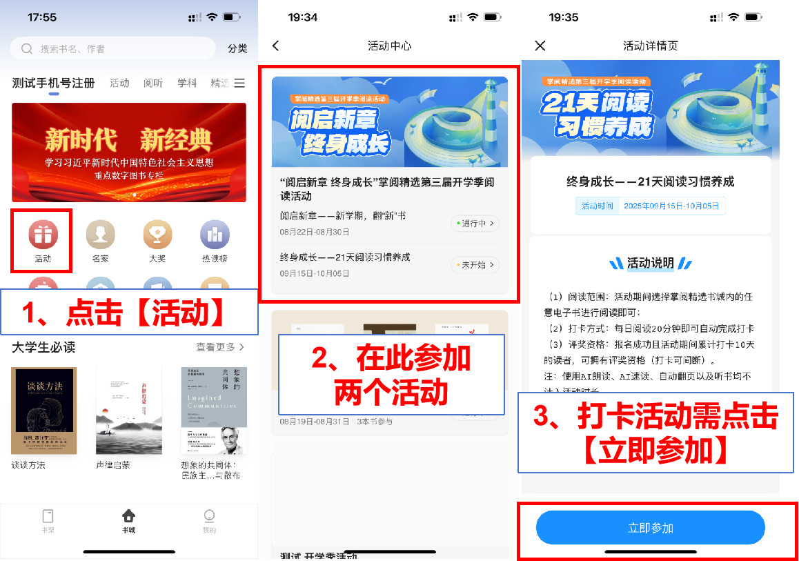 注:打卡活动需要点击【立即参加】才会计时~阅读满20分钟自动打卡,进入打卡页可查看打卡记录。