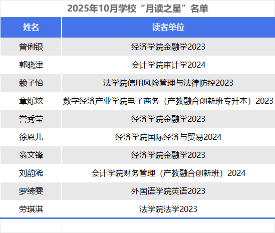 根据《广州商学院“一人一书”计划实施方案》规定,经对2025年10月具有评选“月读之星”资格前40名同学的读书心得进行评审,拟评出10名“月读之星”。现将名单予...