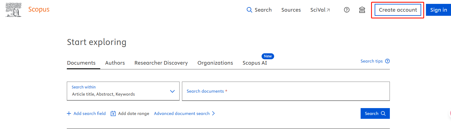 Step 1:打开 Scopus 官网(https://www.scopus.com/),点击右上角“创建账户”,使用学校邮箱(如 xxx@.edu.cn,可在广商教工邮箱查询自己的学校邮箱)注册个人账号。