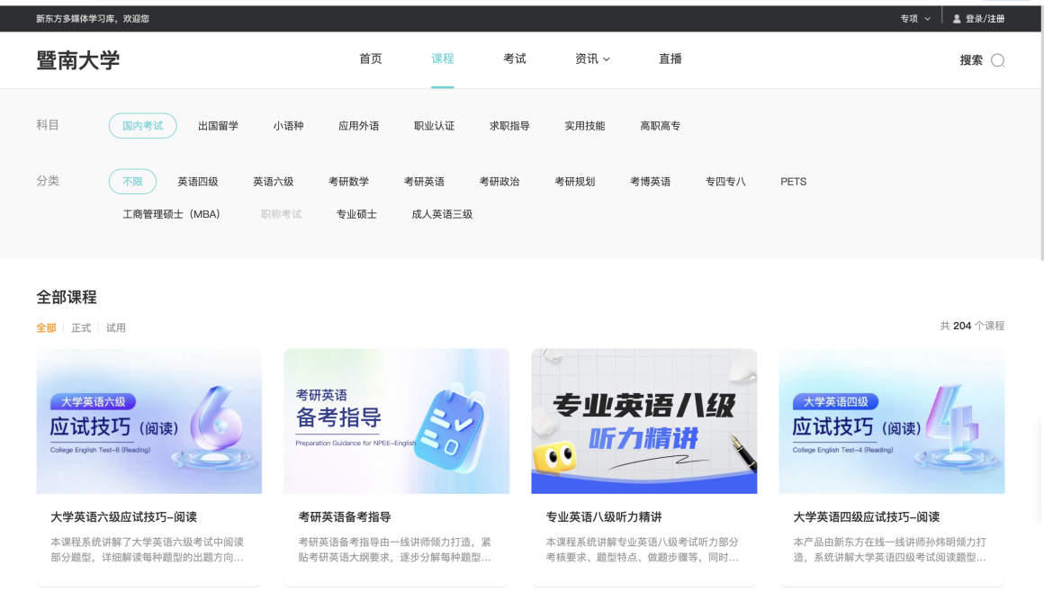 新东方多媒体学习库提供从考试到职场应用等课程,针对不同需求的人群,有着不同的解决方案。